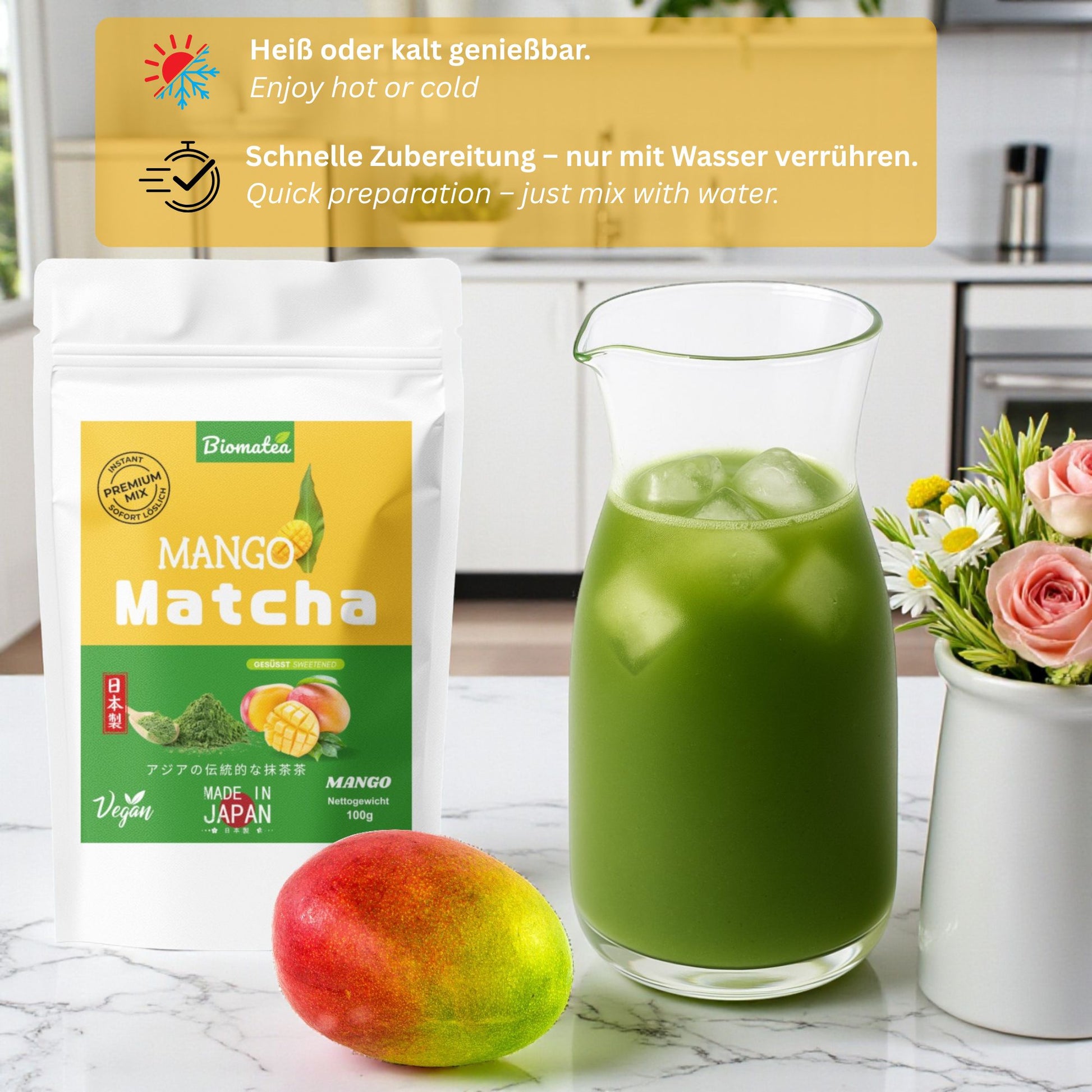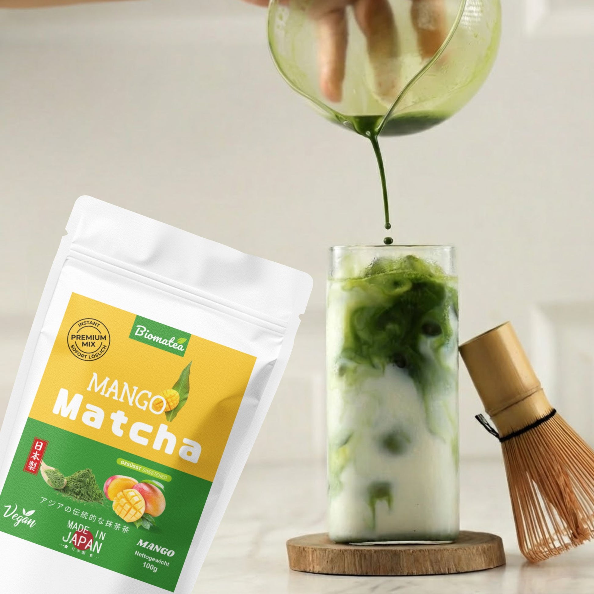 Japanischer Matcha Pulver mit Mango Pulver, gesüßt – 100g – Sofort löslich in Wasser oder Milch, trinkfertig