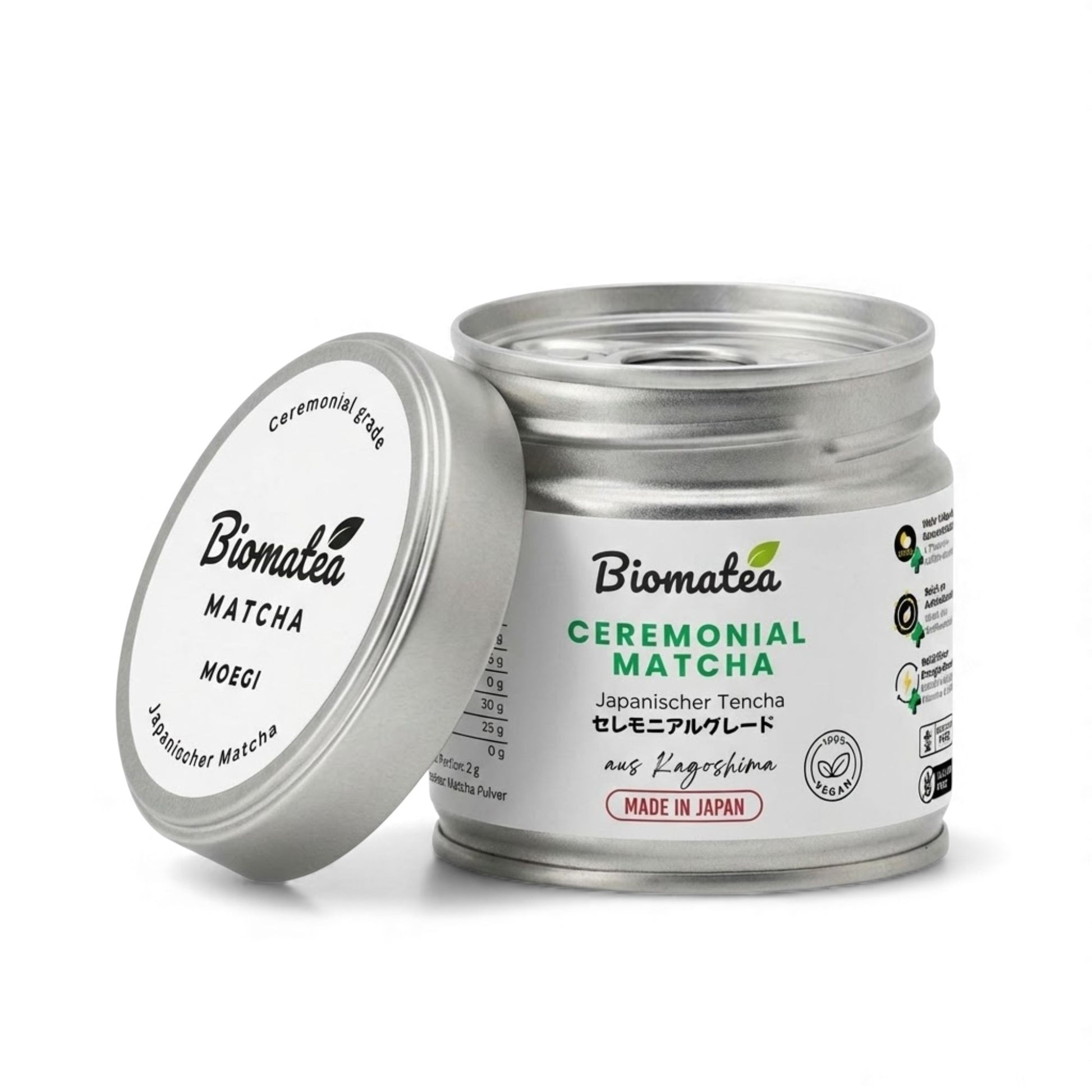 MOEGI Ceremonial Matcha Tee Pulver aus Japan Kagoshima 30 g Dose mit Aufreißlasche. Erste ernte