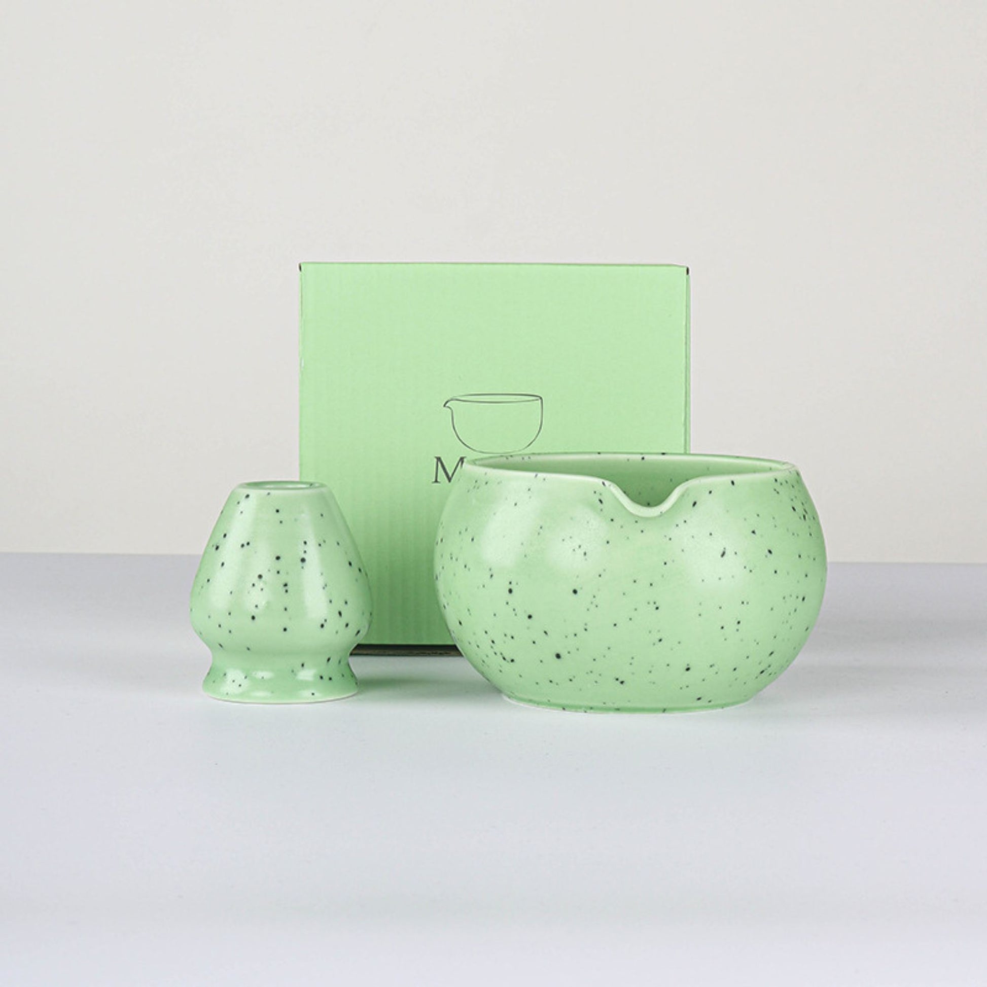 2-teiliges Keramik Matcha Schalen Set Basic | Matcha Schale (500 ml) & Bambusbesen Chasen-Halter, Grün