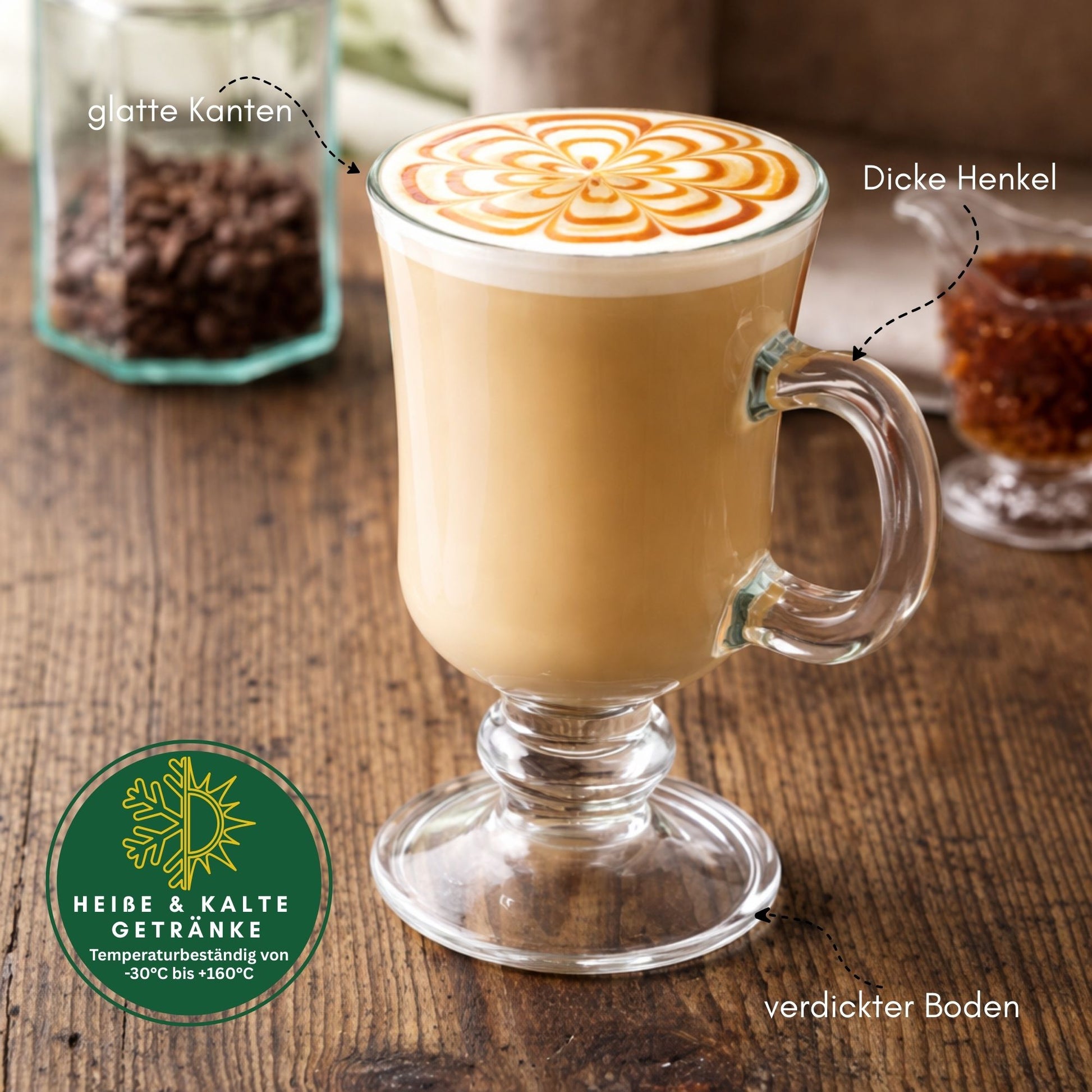 - Sicher & Robust: Dank des dickwandigen Glases und des stabilen Standfußes steht das Glas sicher. Der ergonomische Henkel bleibt angenehm kühl.