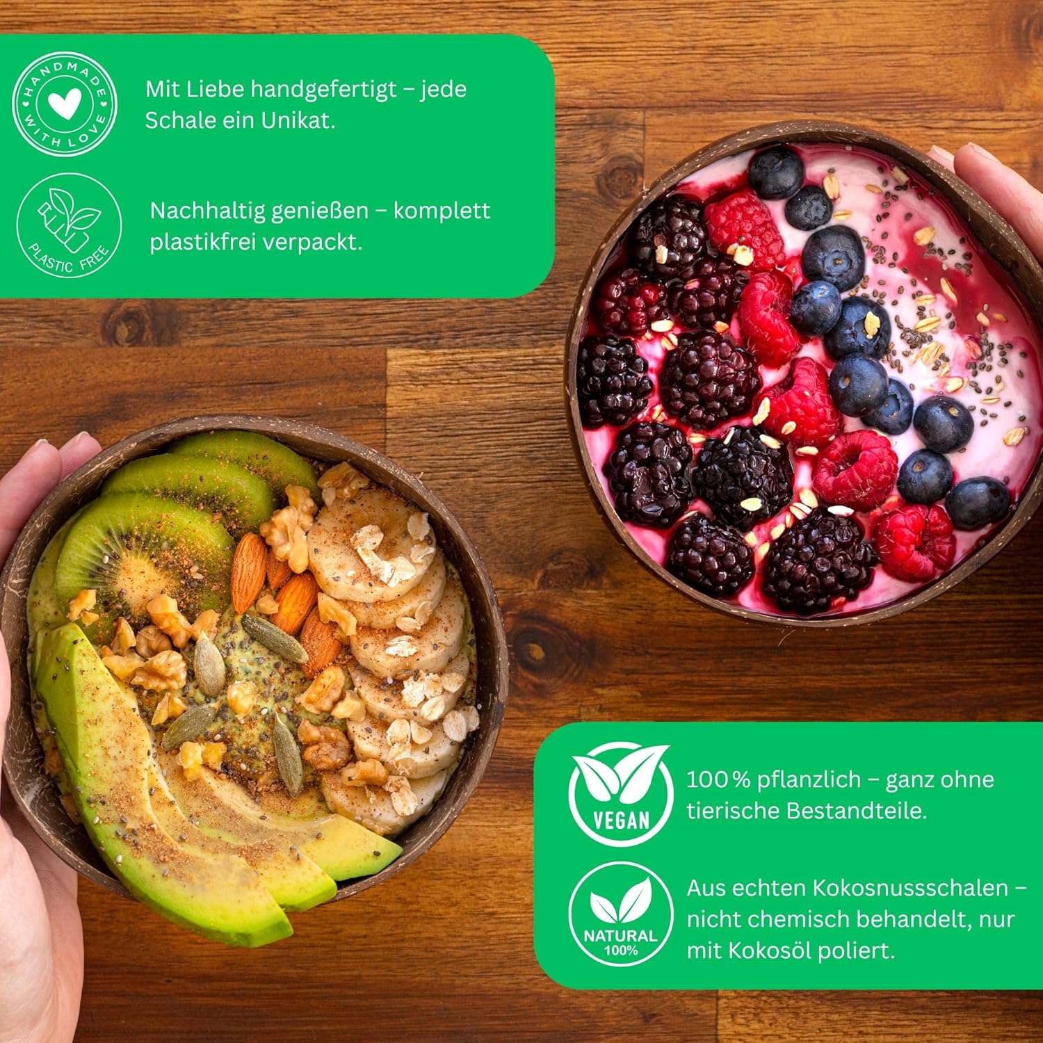 Bee´s Bites Kokosnuss Schalen Set – 2x Kokos-Bowl Schüssel + 2x Löffel – Handgefertigt, Vegan, Natürlich, Chemiefrei, Plastikfrei – Perfekt für Smoothie Bowls.