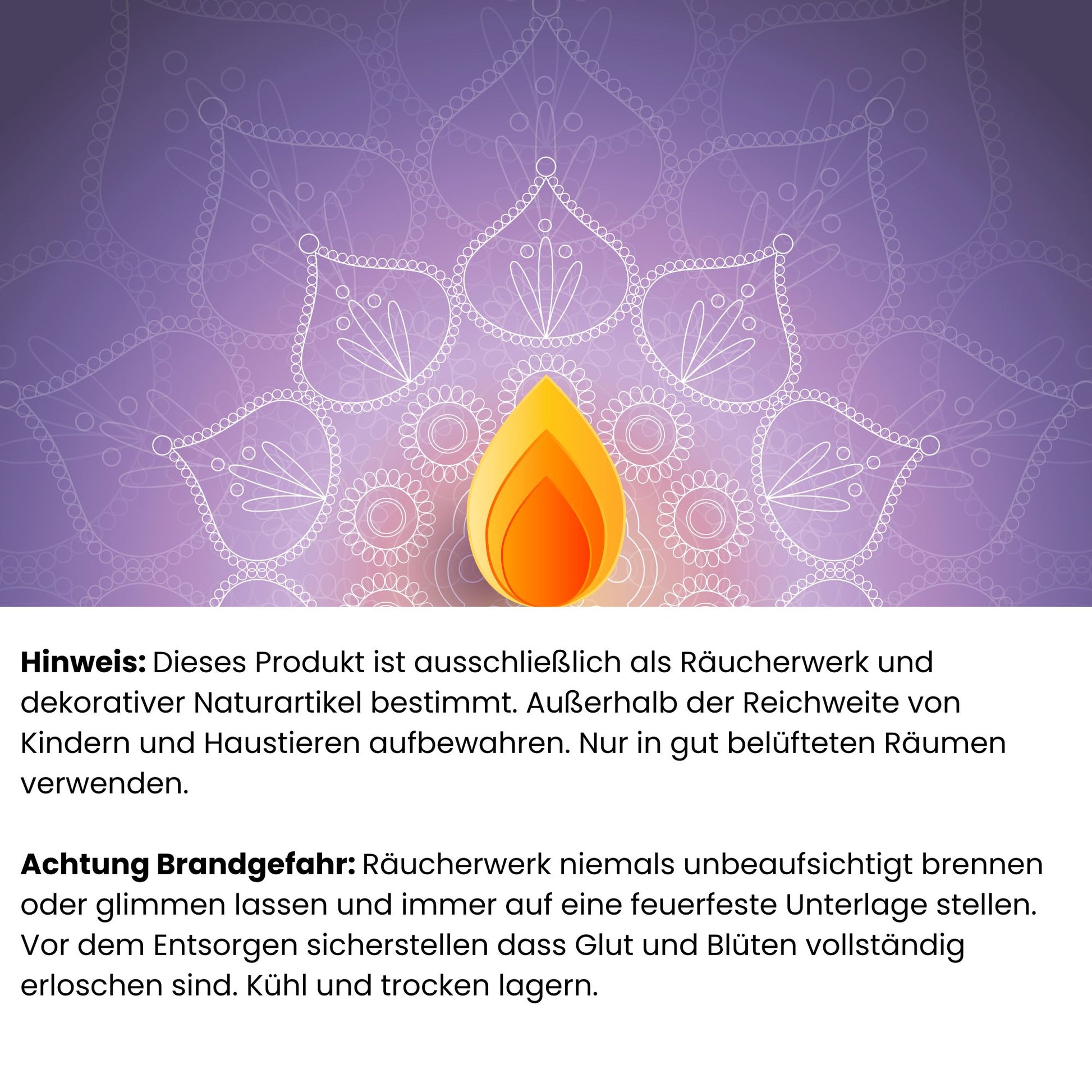 Achtung Brandgefahr: Räucherwerk niemals unbeaufsichtigt brennen oder glimmen lassen und immer auf eine feuerfeste Unterlage stellen. Vor dem Entsorgen sicherstellen dass Glut und Blüten vollständig erloschen sind. Kühl und trocken lagern.