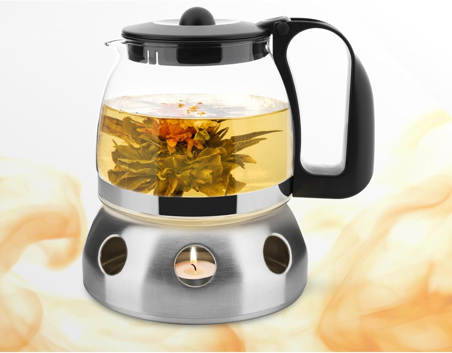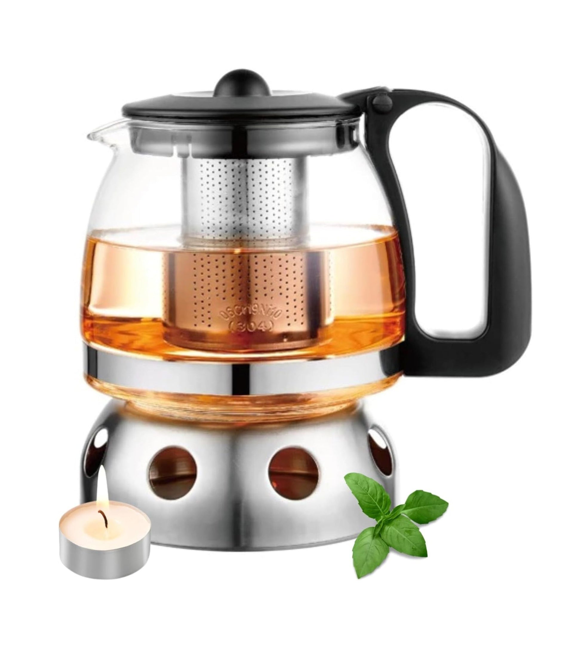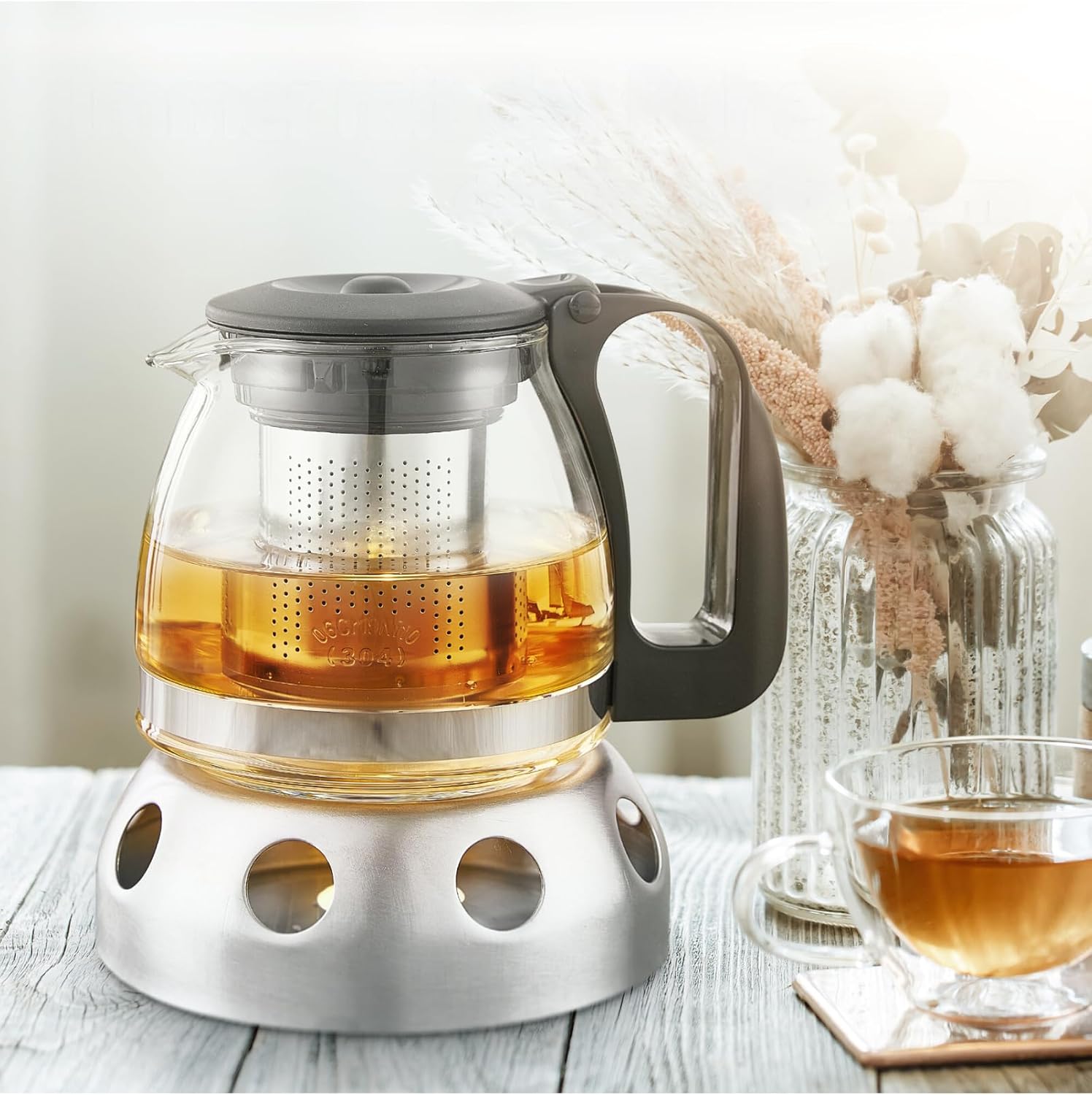 Glas Teekanne aus Glas mit Stövchen + Siebaufsatz, Hitzebeständig, herausnehmbaren Edelstahl Filter Sieb