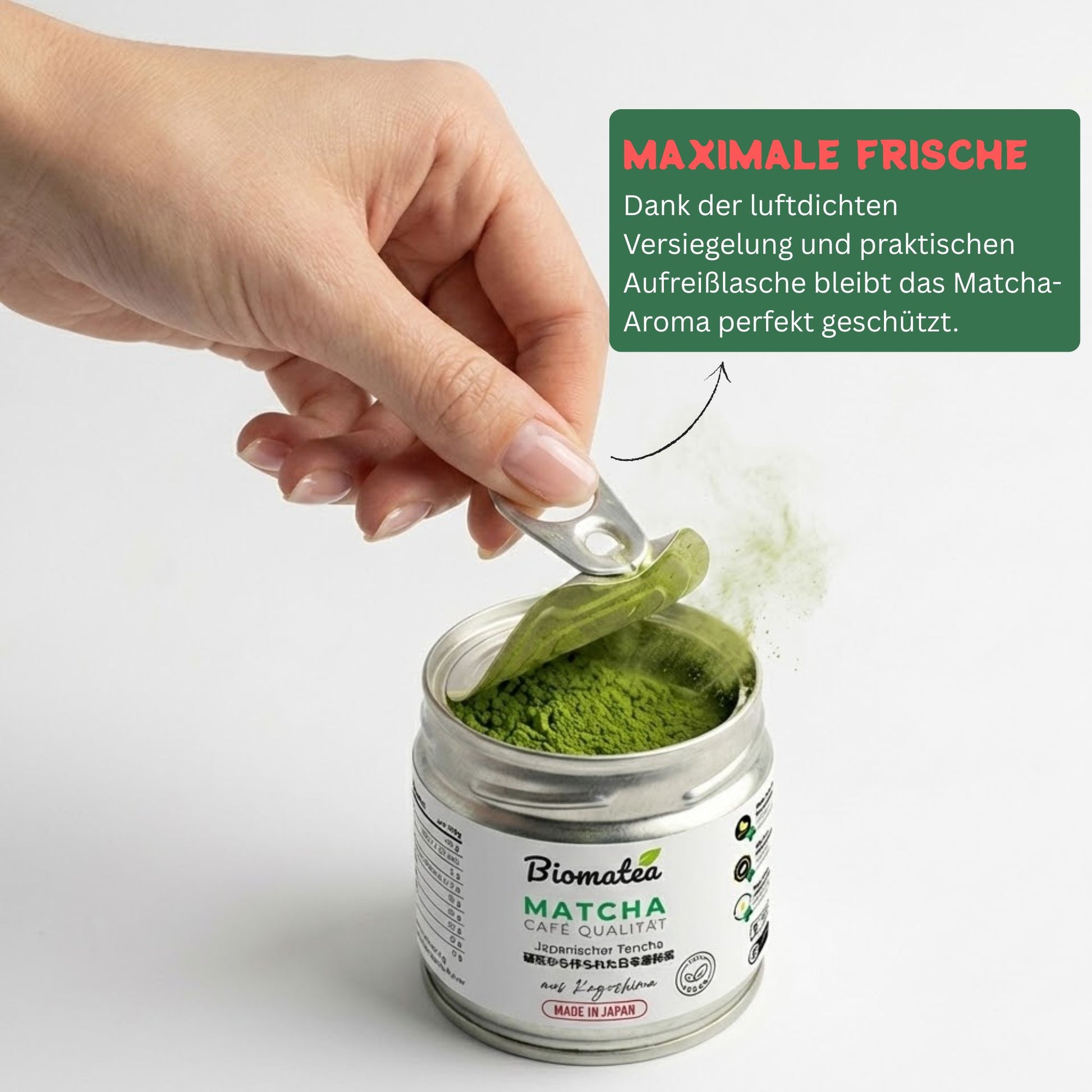 Die 30g Aromadose mit luftdichter Aufreißlasche bewahrt das Pulver zuverlässig vor Aromaverlust und Feuchtigkeit. Dadurch bleibt der Matcha gut löslich, frisch und aromatisch.