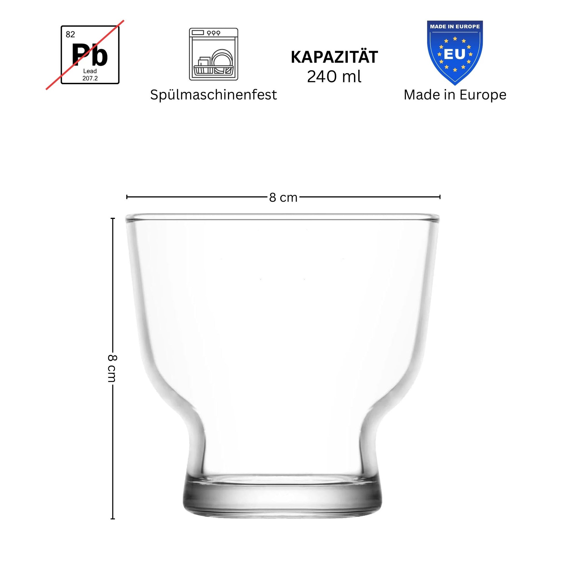 Diese 240 ml Gläser sind echte Allrounder für den täglichen Gebrauch. Ob als Trinkglas, Dessertschale, für Snacks, Joghurt, Müsli oder Saft – das schlichte Design passt zu jedem Anlass. Die robuste, bleifreie Glasqualität sorgt für Langlebigkeit, und dank Spülmaschinenfestigkeit sind die Gläser besonders pflegeleicht. Hergestellt in Europa.